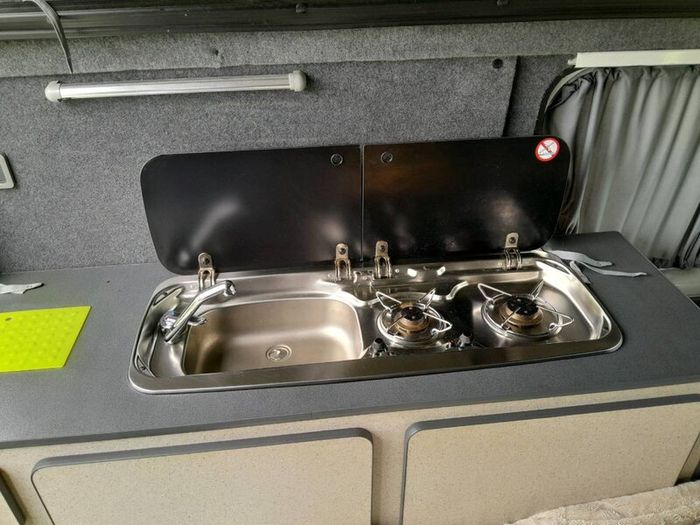 Comes with custom diamond pattern pvc seat covers, 4 large rear windows & curtains, fitted kitchen units with domitec combi sink n 2 gas burner, fire extinguisher, waste & fresh water tanks n pump & electric cool box as in photos.