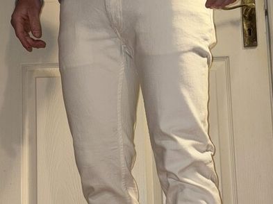 Denim jeans style. Button and zip fastening. Side pockets. Coin pocket. Two patch pockets at the back. Denim-style cotton fabric. Belt loops. Five pockets. Two front welt pockets. Size 44