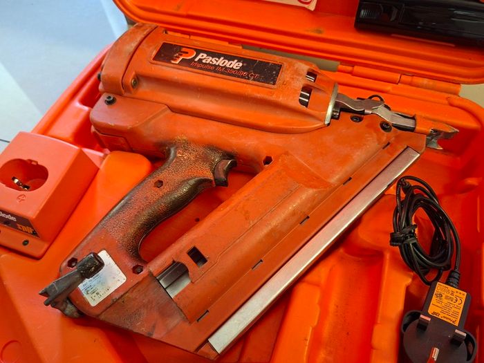 Paslode im350/90 CT 1st Fix Nail Gun No 128 in fair cosmetic condition,this unit has been fully stripped down chemically cleaned and rebuilt,"fully serviced",,service parts cleaned or replaced if required,lubricated,fully checked and tested,Comes with used charger lead,used Dock,2 x New 6v 6 Amp batteries,Allen key,instructions and original box,unit has glue residue on it,,not the cleanest looking gun but shouldn't matter too much as long as you put it to work and don't plan on taking it out for a drink,😁,Working 100% and Ready for Work