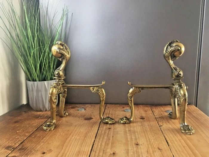 Antique Solid Brass Gothic Fire Dogs Andirons
