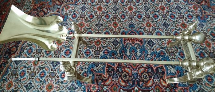 Pair of mid 19th century brass fire dogs.In classical Adams style, together with a large ornate brass shovel and poker.