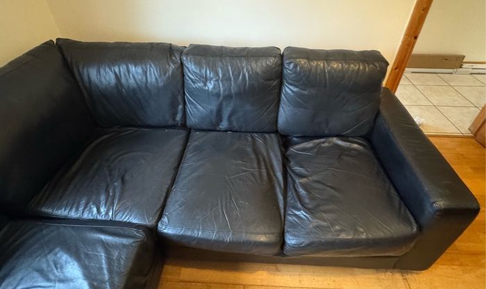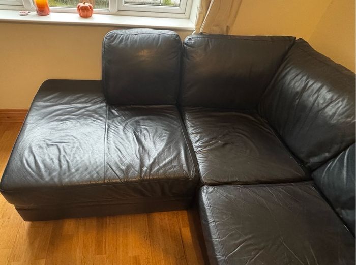 Black leather corner sofa in good overall condition. It is a comfortable and spacious L-shaped couch.